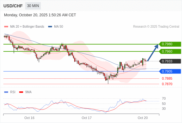 美元/瑞郎 当日内: 在0.7905之上,看涨。