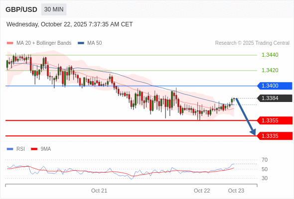 在 1.3400 之下,看跌,目标价位为 1.3355 ,然后为 1.3335 。