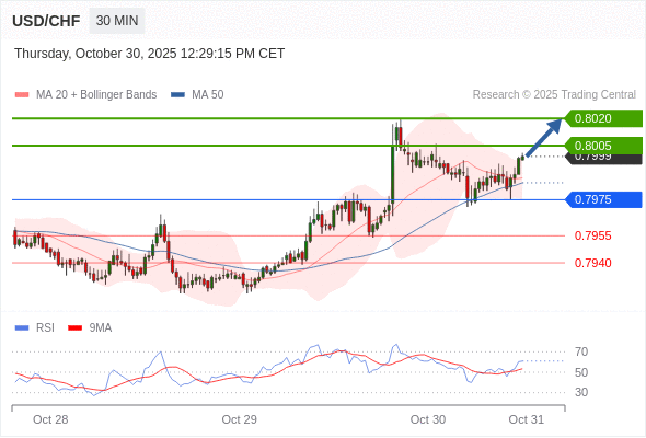 在 0.7975 之上,看涨,目标价位为 0.8005 ,然后为 0.8020 。