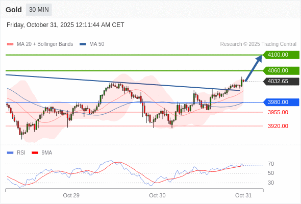 在 3980.00 之上,看涨,目标价位为 4060.00 ,然后为 4100.00 。