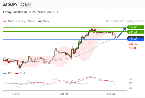 在 153.60 之上,看涨,目标价位为 154.15 ,然后为 154.45 。