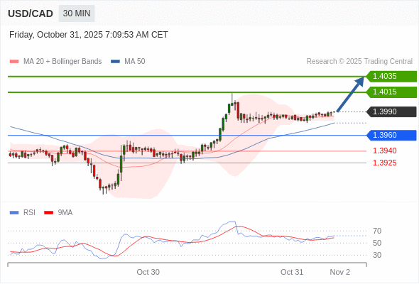 在 1.3960 之上,看涨,目标价位为 1.4015 ,然后为 1.4035 。