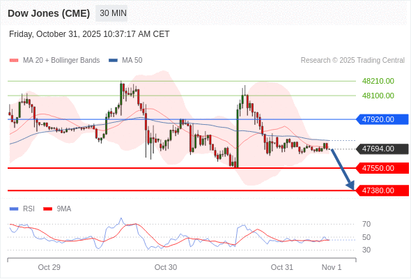 交易策略: 在 47920.00 之下,看跌,目标价位为 47550.00 ,然后为 47380.00 。