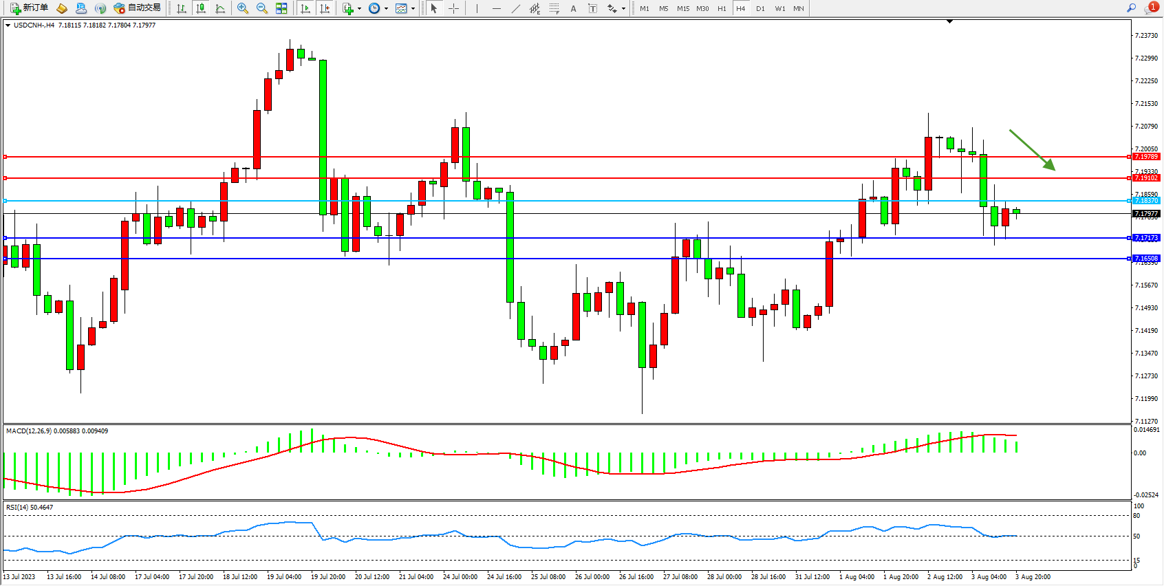 备选策略:7.18370上方看涨,目标7.19102  7.19789