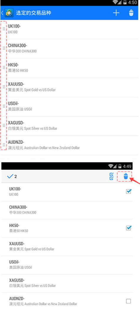 ,然后勾选商品后,点击右上角的删除按钮 ,删除商品。点击编辑按钮回到行情页面。